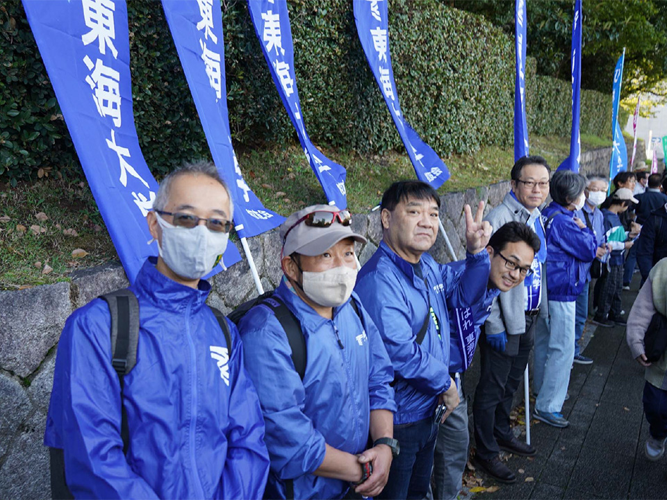 11月5日、「第49回全日本大学駅伝対校選手権大会」の応援を、後援会や大学の応援団、吹奏楽研究会、チアリーディン部の皆様とご一緒に、スタート地点の熱田神宮西門前で行いました。また前夜には、駅伝部の両角監督や応援の学生を激励する壮行会を、名古屋観光ホテルで実施。翌日の大会に備え、大いに鋭気を養って頂きました。