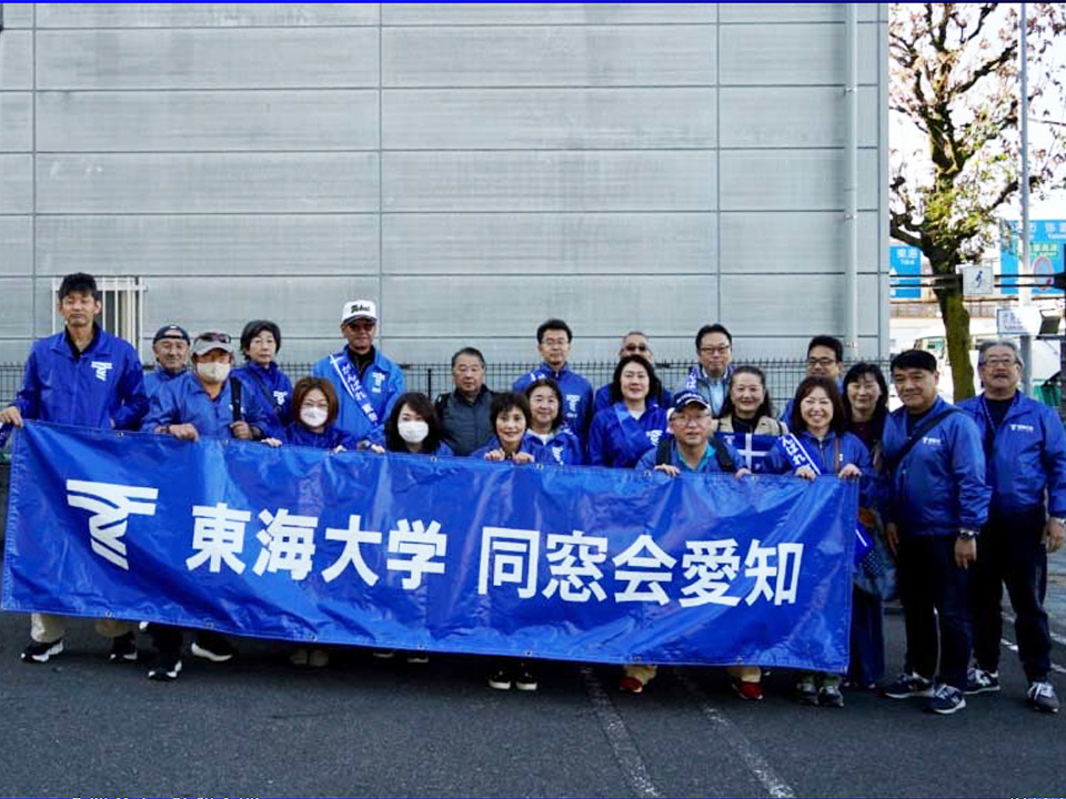愛知支部では、今年もスタート地点の熱田神宮正門前で、校友会や多くの同窓会員の皆様と盛大な応援を行いました。