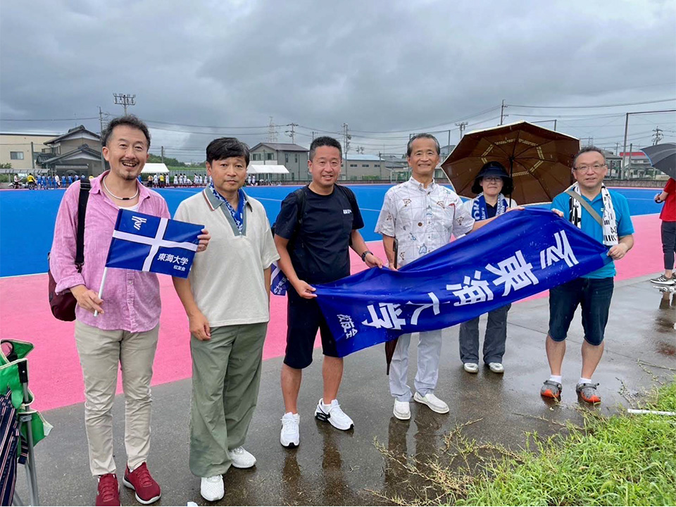 同窓会では、今年も校友会・後援会の皆様と共に、スタート地点の熱田神宮西門前、第1中継所の藤前公園手前で、今回初試みのそろいのポンチョを身に着けて、一帯を東海ブルーに染めた大応援を繰り広げました。また前夜には、応援学生の壮行会や、両角監督への激励も行い、大いに鋭気を養って頂きました。