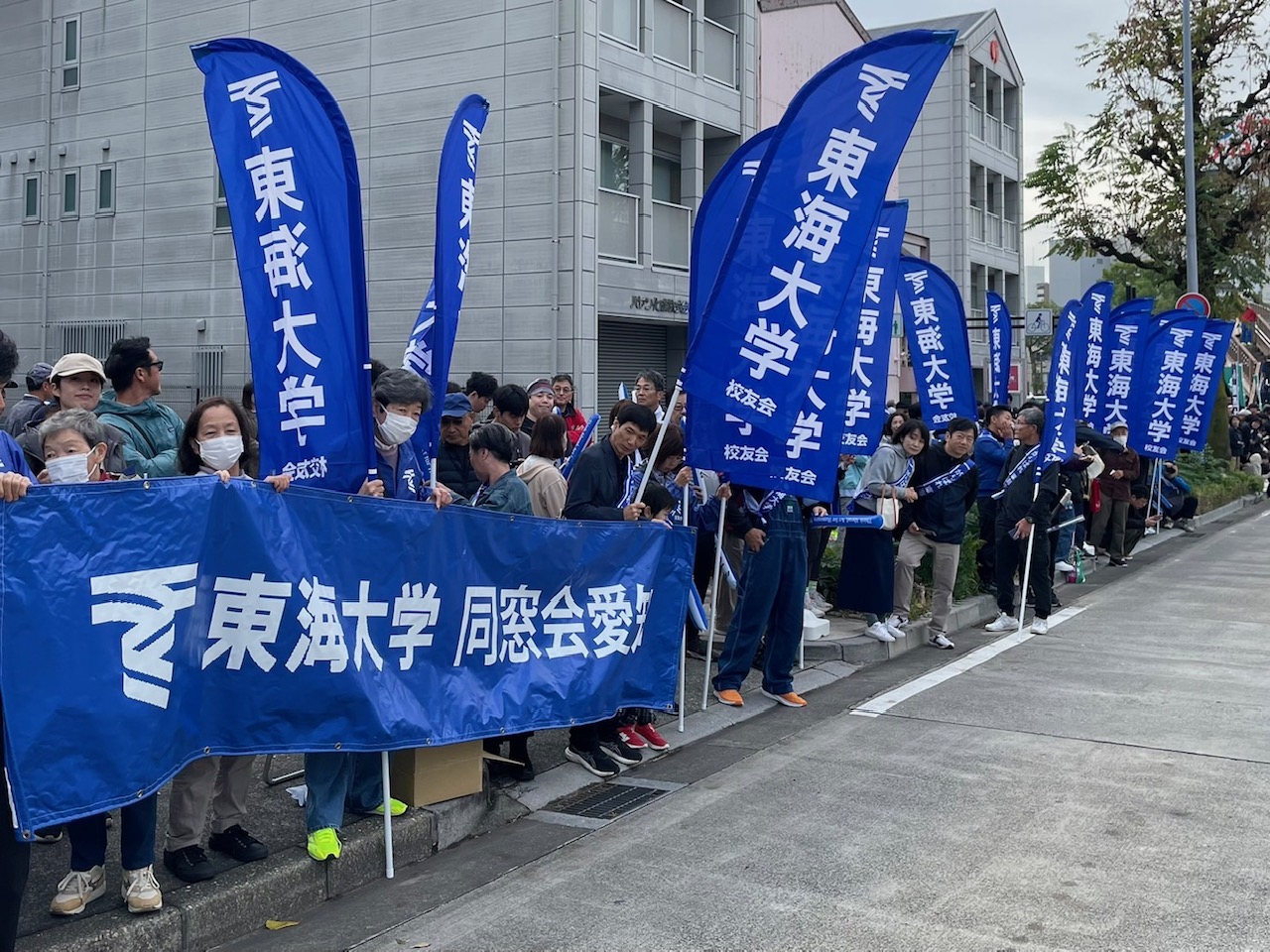 愛知支部では、今年もスタート地点の熱田神宮正門前で、校友会や多くの同窓会員の皆様と盛大な応援を行いました。